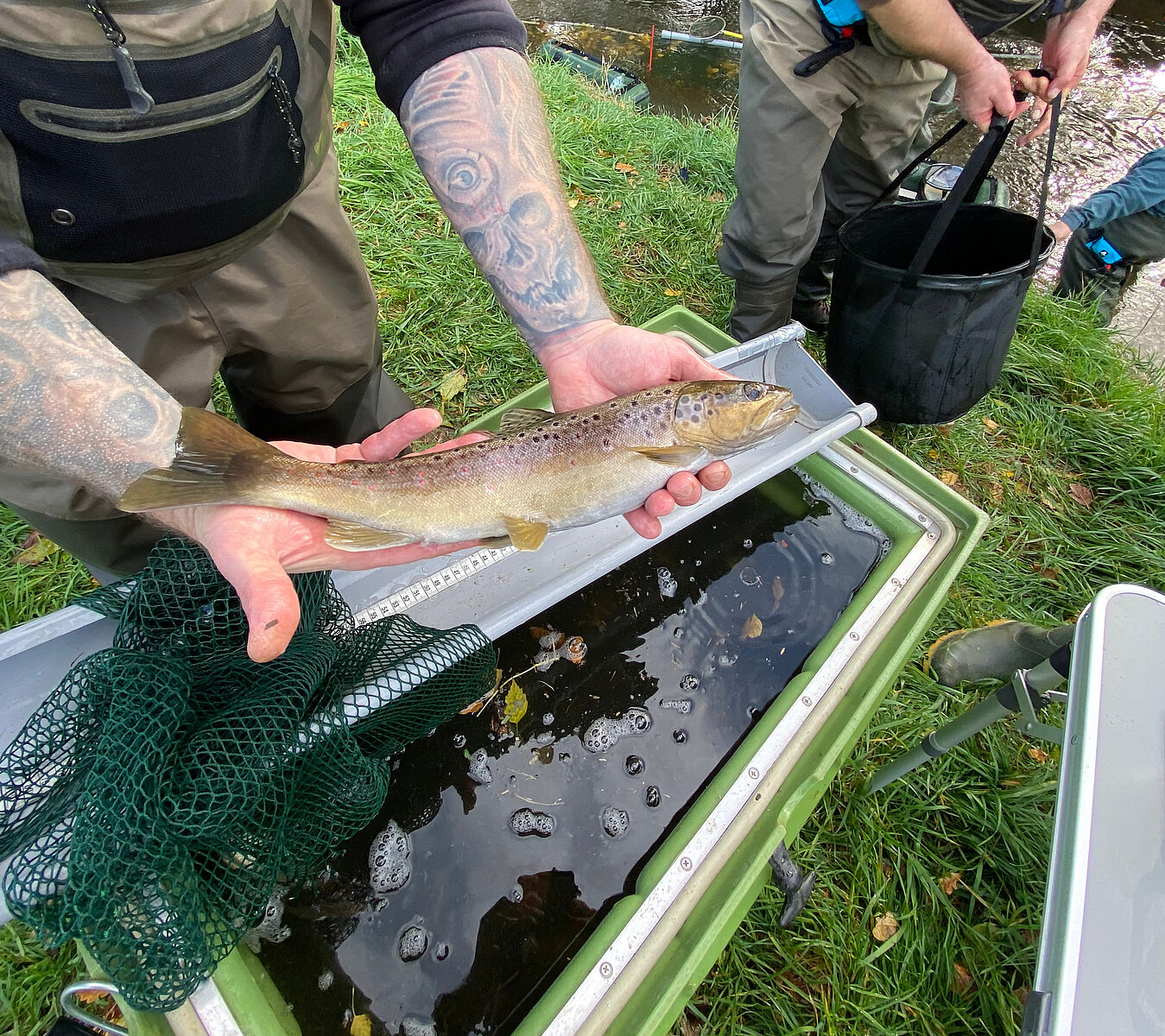 Am 26. Oktober 2022 wurden die Fischbestände der Spree auf einen Abschnitt von ca. 400 m Länge in zwei Durchgängen mittels Elektrobefischung untersucht. Zuvor wurde am Ende der Befischungsstrecke eine Absperrung eingebracht, durch die das Auswandern von Fischen und Neunaugen während der Untersuchung verhindert werden sollte. Alle Fische wurden auf Artniveau bestimmt und deren Länge aufgenommen. Zusätzlich wurde eine dem Gesamtfang entsprechende Anzahl von Individuen pro Art gewogen. Insgesamt konnten bei zwei Durchgängen 1.739 Individuen aus neun Arten dokumentiert werden.
